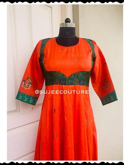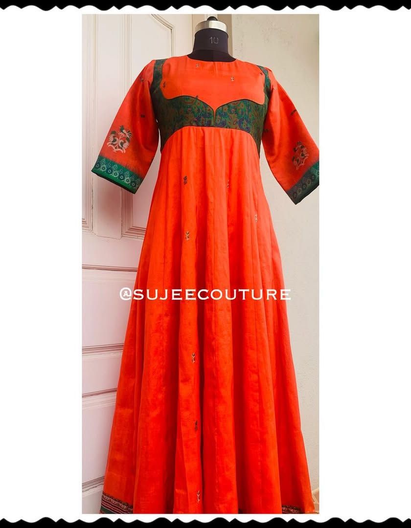 For celebrations that call for something different, I also design custom gowns and dresses. These pieces blend modern silhouettes, like the Anarkali style, with my signature traditional embroidery and rich fabrics.