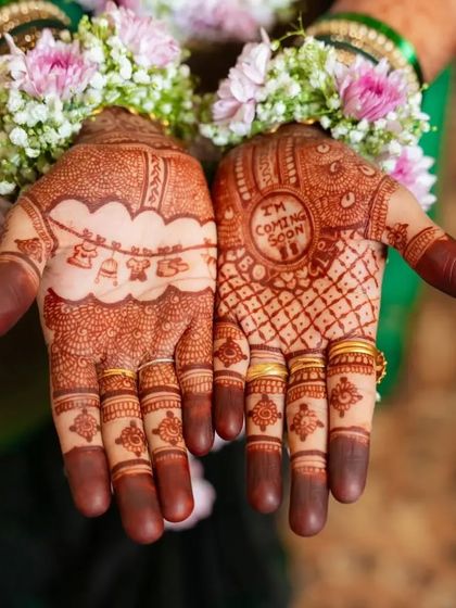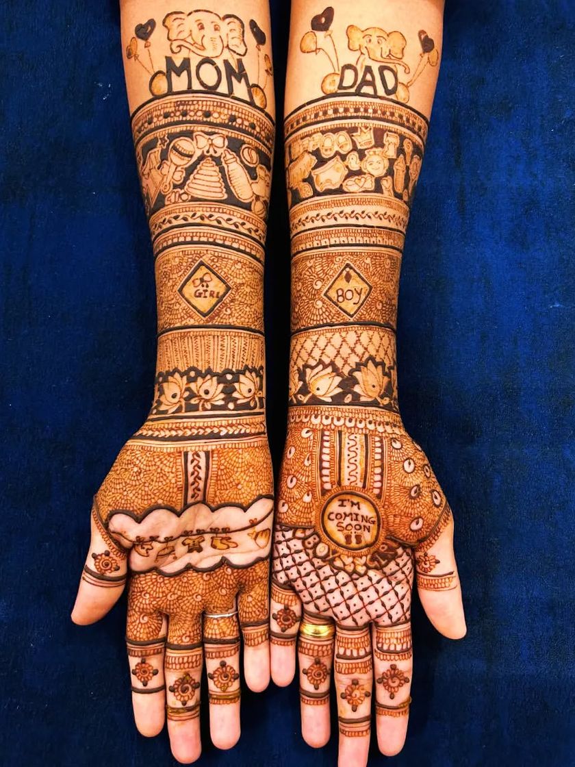 I create special mehendi designs to celebrate the wonderful journey of motherhood. From cute baby motifs and "Mom-to-be" messages to traditional patterns that bless the new arrival, each design is made with love for your baby shower.