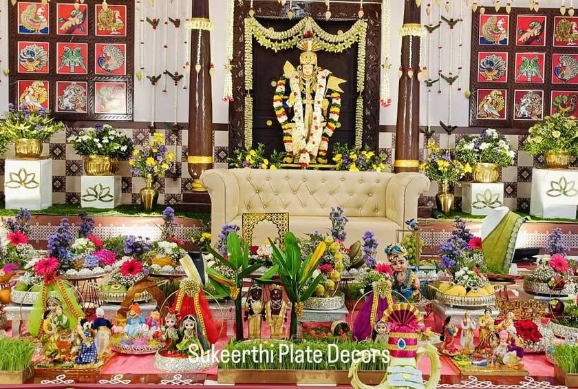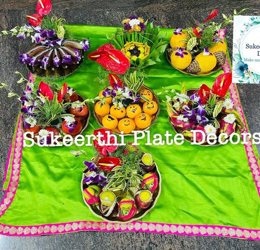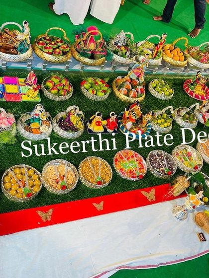 I create vibrant and traditional platter decorations for puberty (Manjal Neerattu Vizha) and ear-piercing (Kadani Vizha) ceremonies. These setups include everything from fruits and sweets to decorated coconuts and thematic dolls, arranged beautifully on floor carpets or stands.
