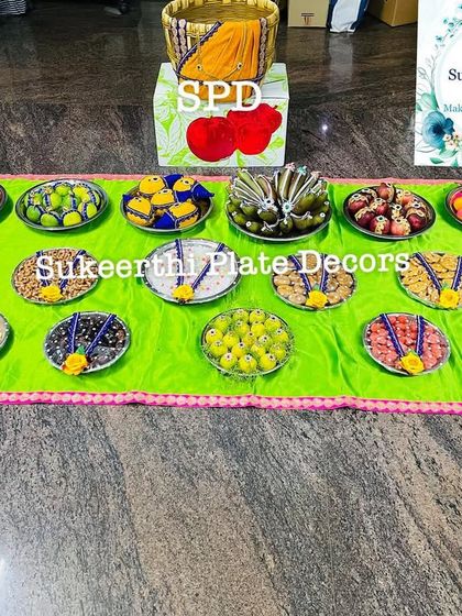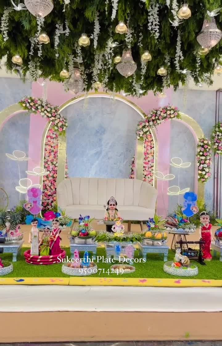 I create beautiful seer varisai platter arrangements for Valaikaapu ceremonies to welcome the little one. Each setup is fully customized, featuring thematic dolls, props like cradles and swings, and a choice of German silver or traditional platters.