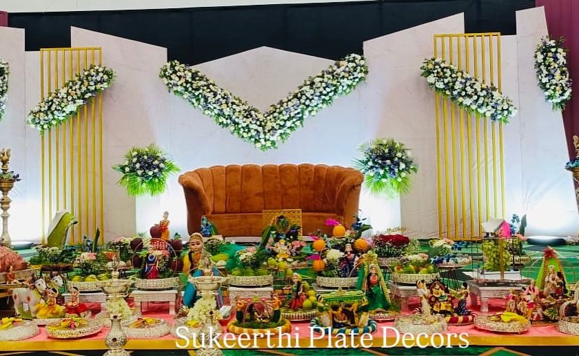 For engagements and weddings, I design elaborate 'seer varisai' displays that reflect your family's traditions. We can customize the entire setup, including thematic dolls and decorated plates, to match your event's colours and style.