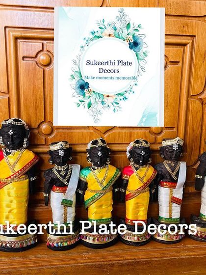 Marapachi Bommai are my specialty and a true passion. I hand-decorate these traditional wooden dolls, dressing them in miniature sarees and dhotis with detailed jewellery, to bring 'nalla vibration' to your home or event. These are available for purchase or rent.