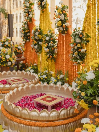 I love designing pre-wedding events that are bursting with color, joy, and personality. Whether it's a traditional Haldi with marigolds and a golden lotus or a chic Mehendi with floral swings and fun activities, I create the perfect backdrop for laughter and celebration.