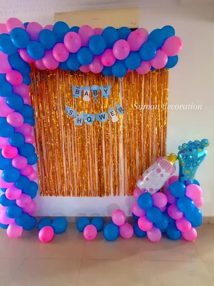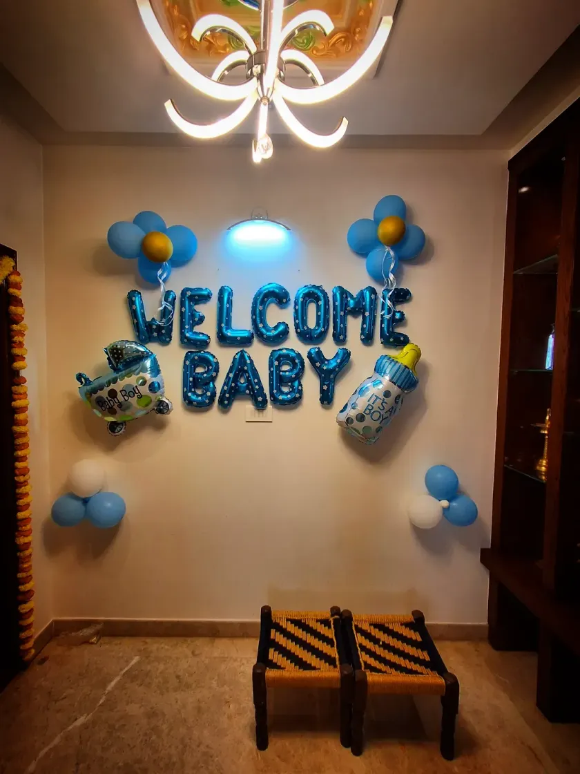 I offer special decoration packages for baby showers and welcoming a newborn home. These setups can include 'Welcome Baby' or 'Oh Baby' signs, balloon decorations in soft colors, and cute props like 'BABY' blocks to celebrate the new arrival.