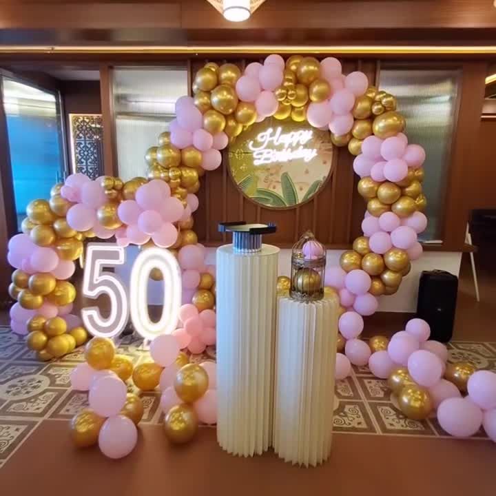 I design stylish and elegant decorations for milestone birthdays, anniversaries, and romantic surprises. These setups often feature sophisticated color palettes like black and gold or rose gold, along with neon signs, shimmer walls, and beautiful balloon arrangements to create a memorable atmosphere.