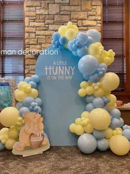 I arrange beautiful decorations to welcome a new baby or for baby showers and gender reveal parties. Setups can include "Welcome Baby" foil balloons, cute themes like teddy bears or bees, balloon-filled "BABY" blocks, and classic blue, pink, or modern sage green color palettes.
