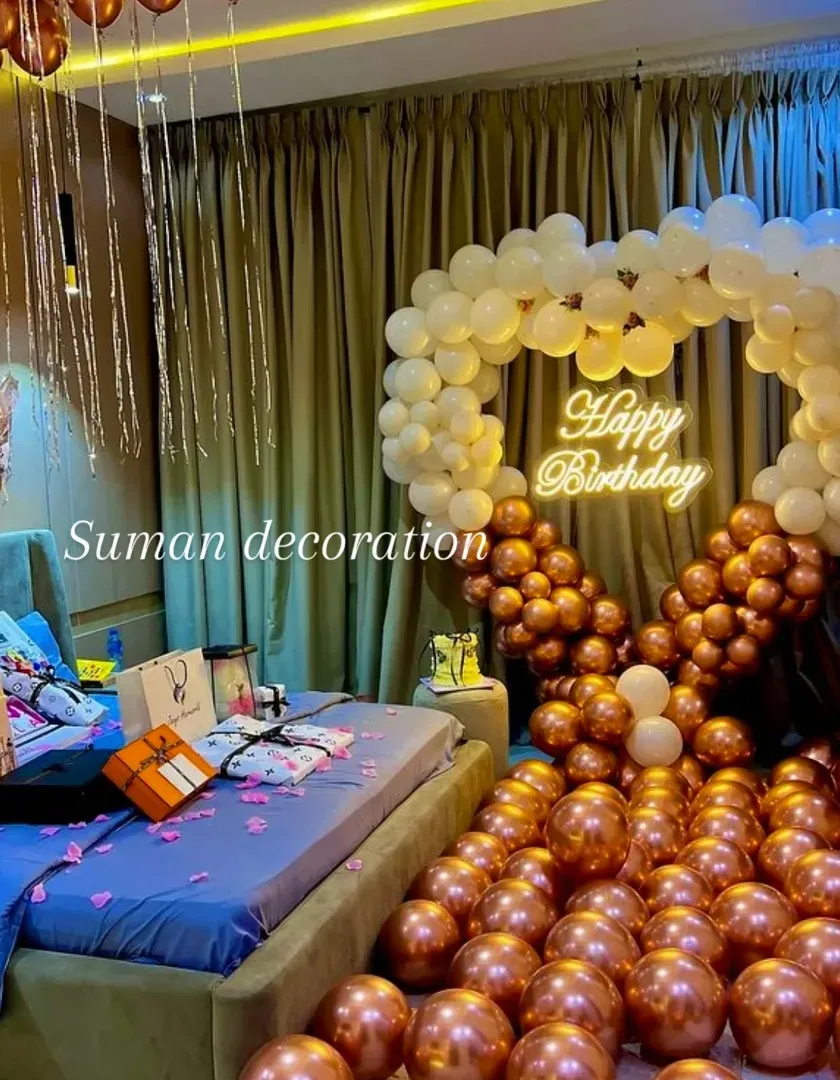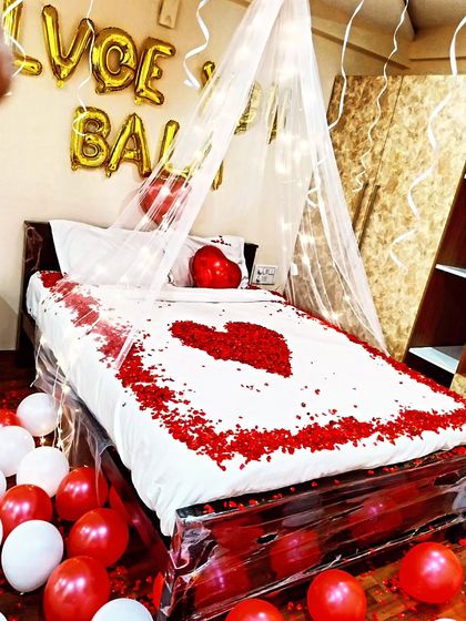 I create romantic room decorations for anniversaries, proposals, or just a special surprise. I use elements like heart-shaped balloon arches, rose petals on the floor and bed, fairy lights, and neon signs to set a memorable mood.