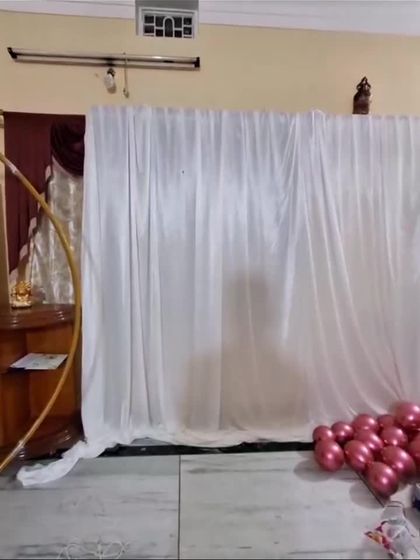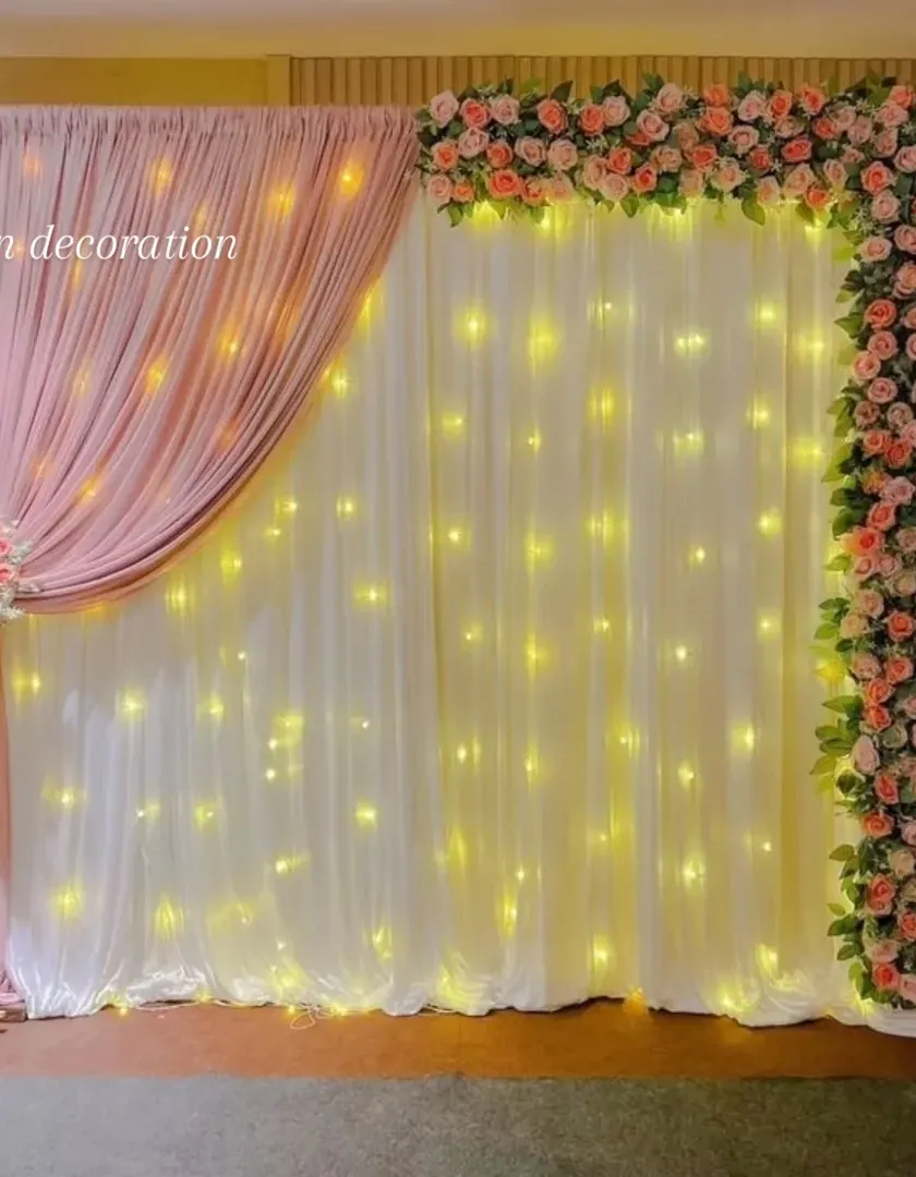 I can create the perfect spot for photos at your party with custom backdrops. I offer designs using elegant drapes, shimmering sequin walls, fairy lights, and artificial flowers to match any event theme.