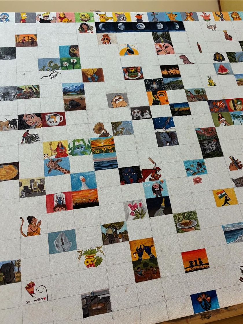 This large canvas is a collection of over 200 tiny paintings, each one inspired by suggestions from my amazing followers. It includes everything from cartoon characters and movie scenes to food, animals, and everyday moments. This project is a celebration of shared memories and the little things that bring us joy.