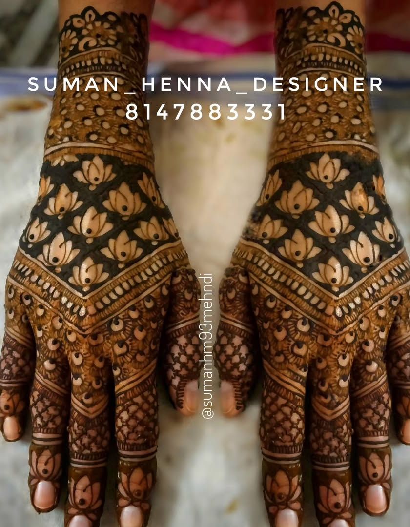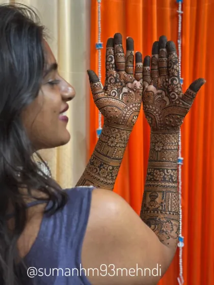 This is my specialty. I create intricate, full coverage designs that extend from your fingertips to your elbows, blending traditional patterns with your personal style. Each design is unique, using my homemade, natural henna for a rich, dark stain.
