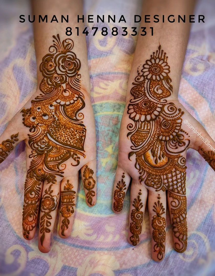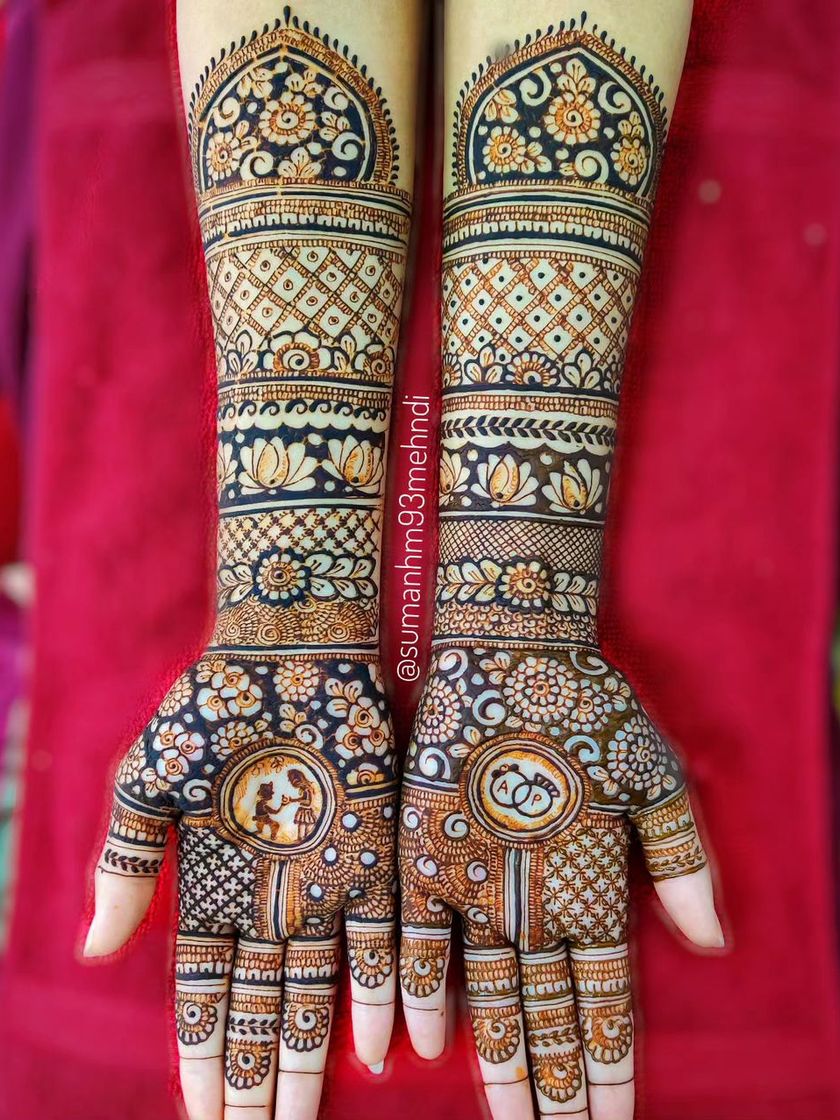 For those who love detailed and elaborate patterns, these full-hand designs are perfect for engagements, weddings, and major celebrations. I combine traditional Indian elements like paisleys, lotuses, and checks with custom figures to create a dense and stunning look.