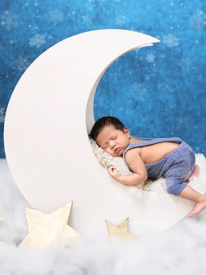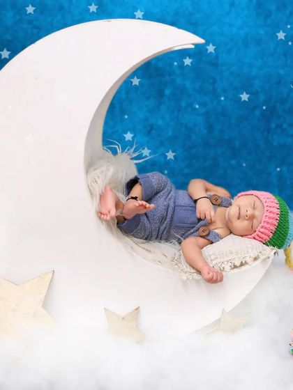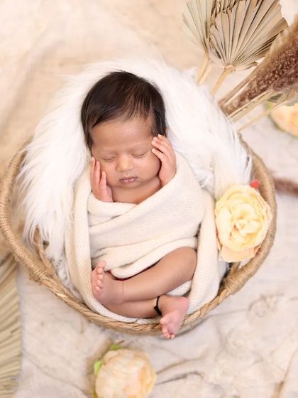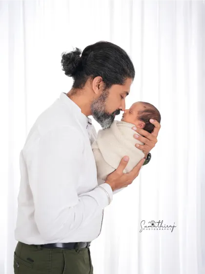 I do safe and simple newborn photoshoots in a warm studio with lots of props and themes, and I include family members in the session, best done when your baby is 5 to 15 days old.