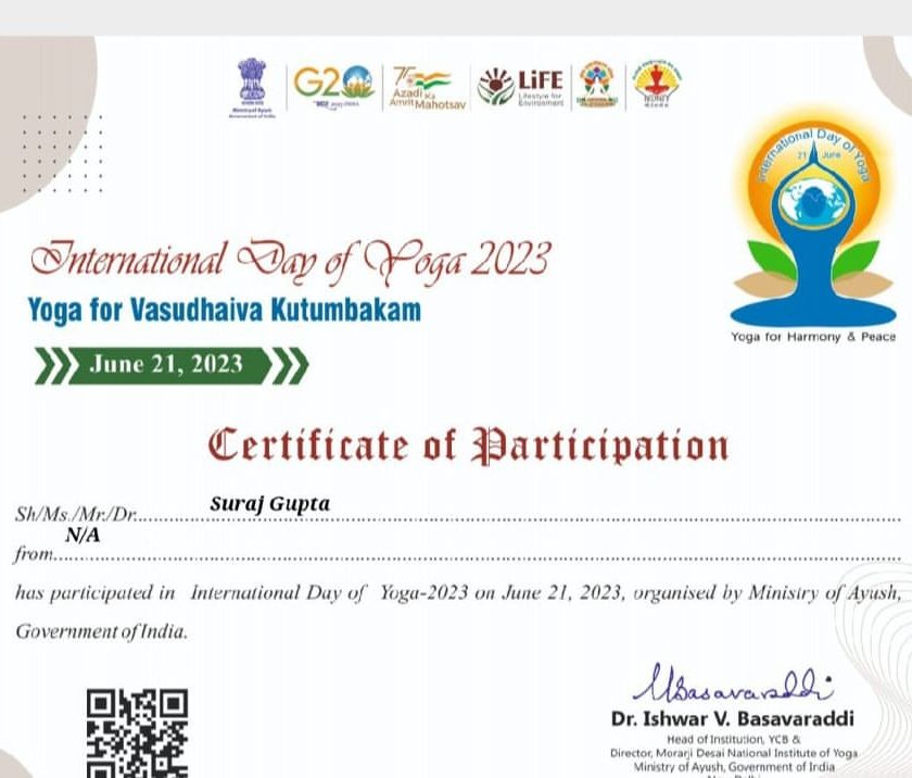 I am certified by the Ministry of Ayush and have been recognized at various events for my work in promoting yoga. I regularly participate in and lead sessions for large scale events like International Day of Yoga.