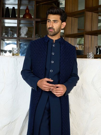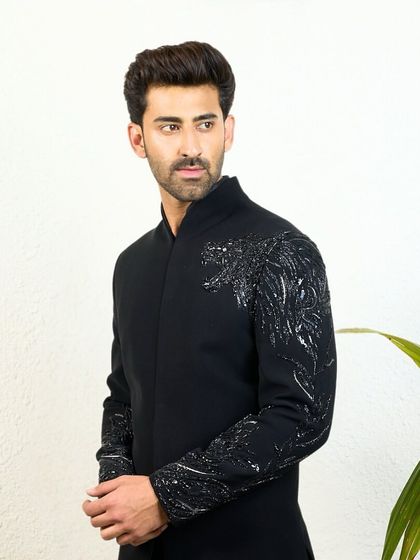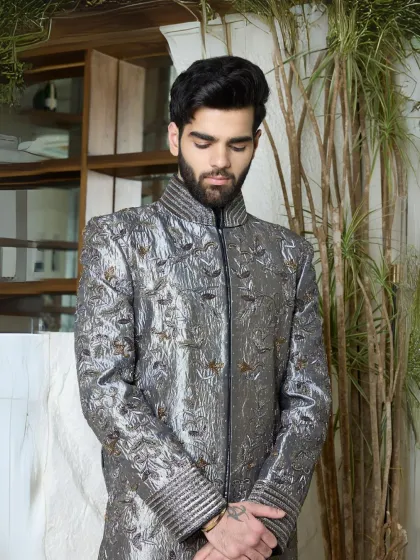 - Sherwanis that are regal but not OTT, including my signature off-white or bold gunmetal with threadwork