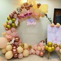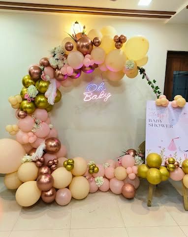 We create beautiful backdrops for baby showers, from elegant and modern themes to classic "Oh Baby" setups. We can customize the design with neon signs, specific color palettes like pastels or rose gold, and accommodate both large venues and intimate home parties.