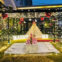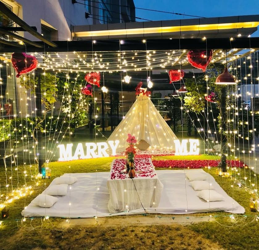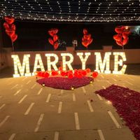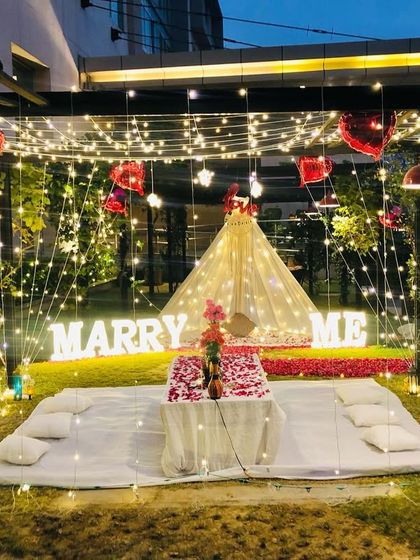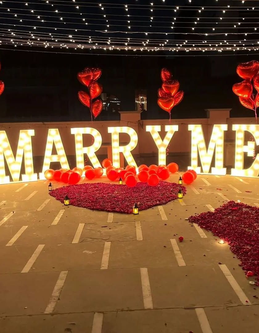 We create unforgettable moments with large-scale decorations perfect for popping the question. This includes dramatic "MARRY ME" marquee letters, romantic red carpets of flower petals, and stunning backdrops set up on rooftops or in gardens across Bengaluru.