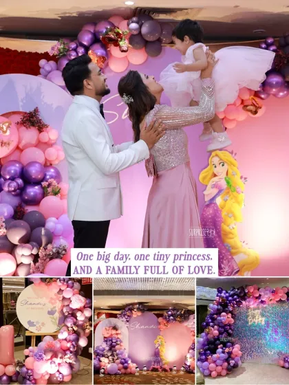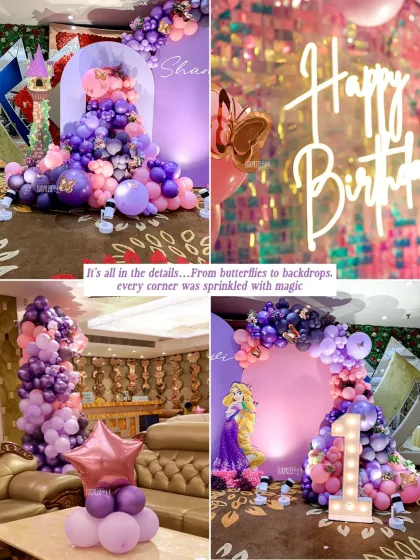 Custom Themes & Backdrops - From Dior-themed baby welcome to Rapunzel birthday decor, we handle every detail, even invites.