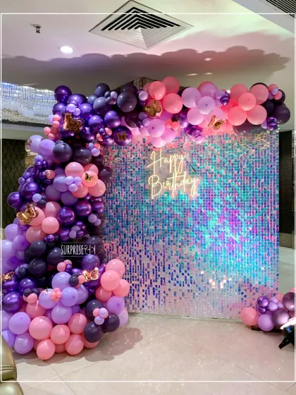 - Balloon Work: L-shaped or semi-arch arrangement using 200+ Chrome and Pastel Matte balloons (no basic metallic balloons).