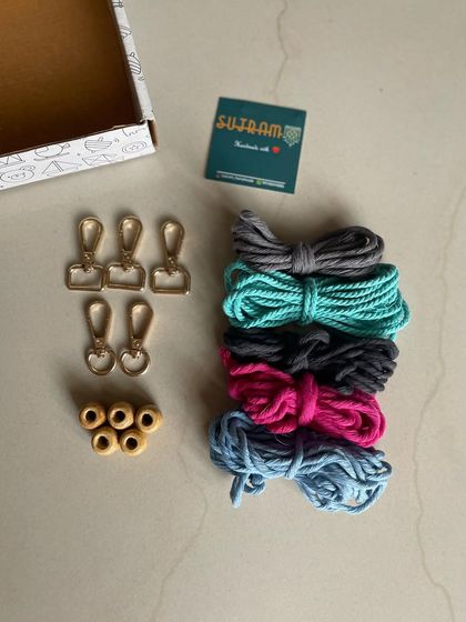 I believe in using good, eco-conscious materials that feel nice to work with. Here is a detailed view of the high quality, earth friendly cotton cords, classic wooden beads, and sturdy golden hooks you will get in every kit.