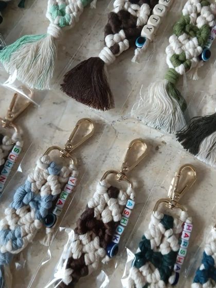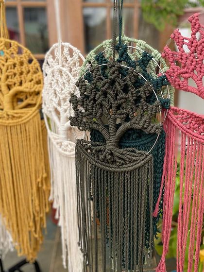 We create handcrafted macrame accessories including intricate wall hangings, dream catchers with "Tree of Life" motifs, tealight holders, coasters, and personal items like keychains and bag charms. Each piece showcases detailed knotting techniques and uses earth-friendly materials.