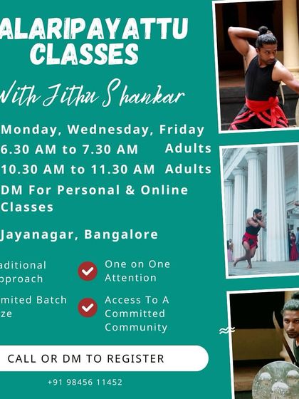 We teach Kalaripayattu in small groups for all ages, with personal guidance, traditional methods, and options for in-person or online classes.