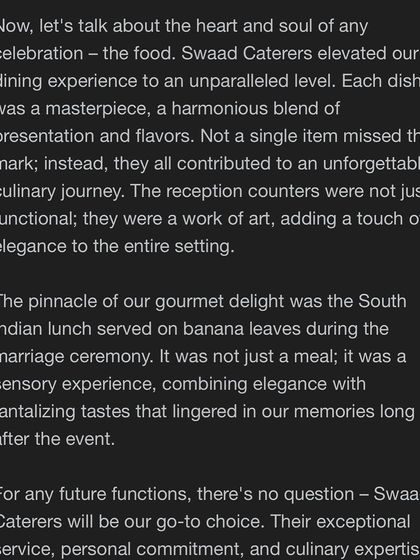 Full Event Catering - We handle weddings, sangeeth, housewarmings, corporate gigs - you name it. North Indian, South Indian, Chinese, Jain food.