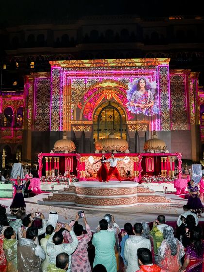 I specialize in creating large-scale, dramatic environments that transform spaces into breathtaking worlds. This includes everything from massive custom-built stages with projection mapping on palace facades to entire ballrooms draped in florals and chandeliers.