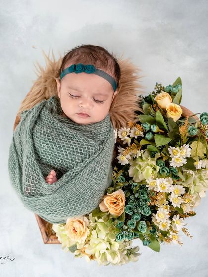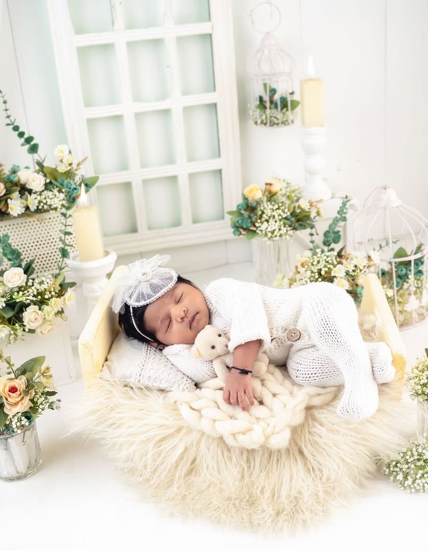 I love surrounding newborns with the delicate beauty of flowers, creating a soft, ethereal, and timeless portrait. These setups range from lush garden scenes to simple, elegant floral accents in various color palettes like angelic whites and soft pastels.