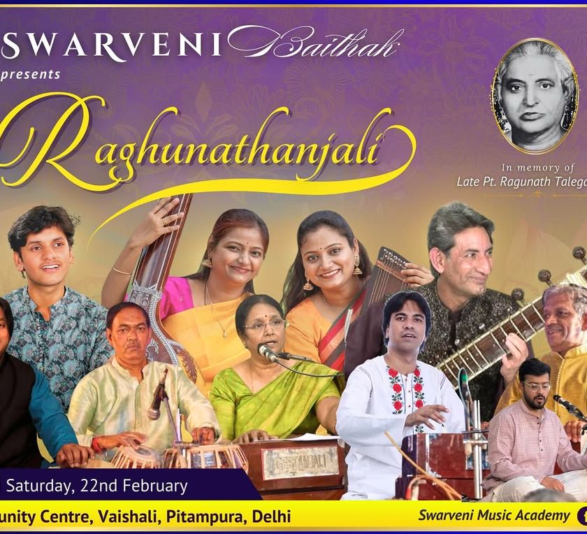A special baithak organized in collaboration with Sangeet Kala Kendra, Agra, 'Raghunathanjali' is a tribute event featuring a stellar lineup of artists. This annual program honors the legacy of great musicians and includes performances, felicitations, and the presentation of the 'Swarveni Kalasetu' Award.