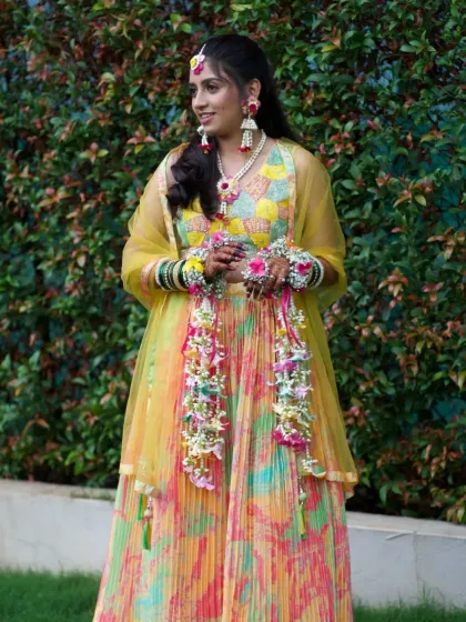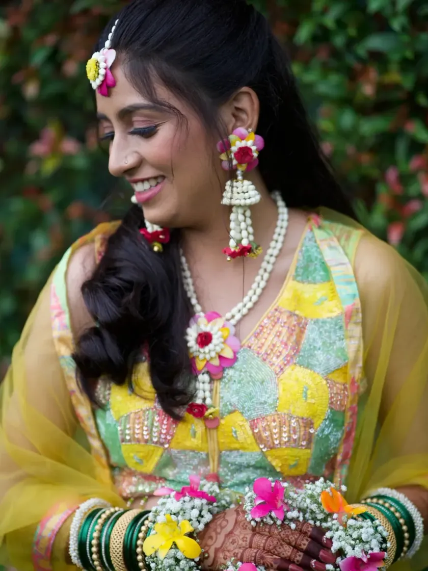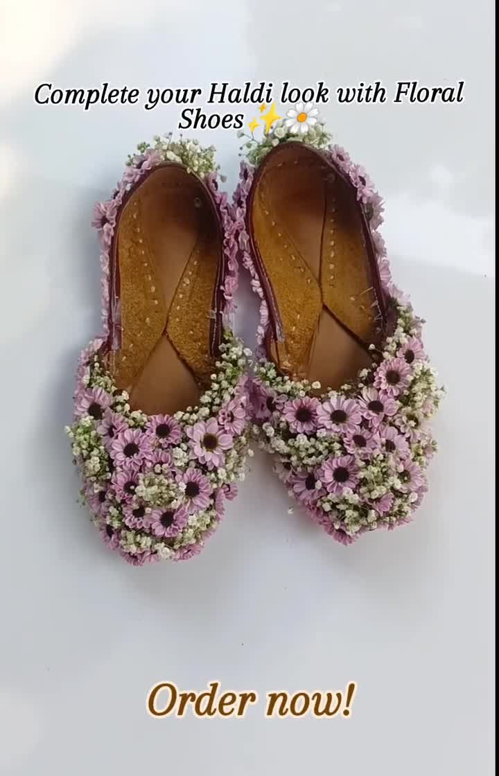Beyond traditional jewellery, I love to experiment with unique floral creations to make your look truly one-of-a-kind. This includes custom floral-decorated shoes or 'juttis' that are perfect for completing your Haldi or Mehendi outfit from head to toe.
