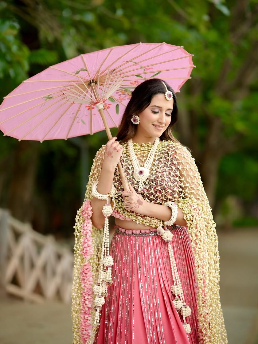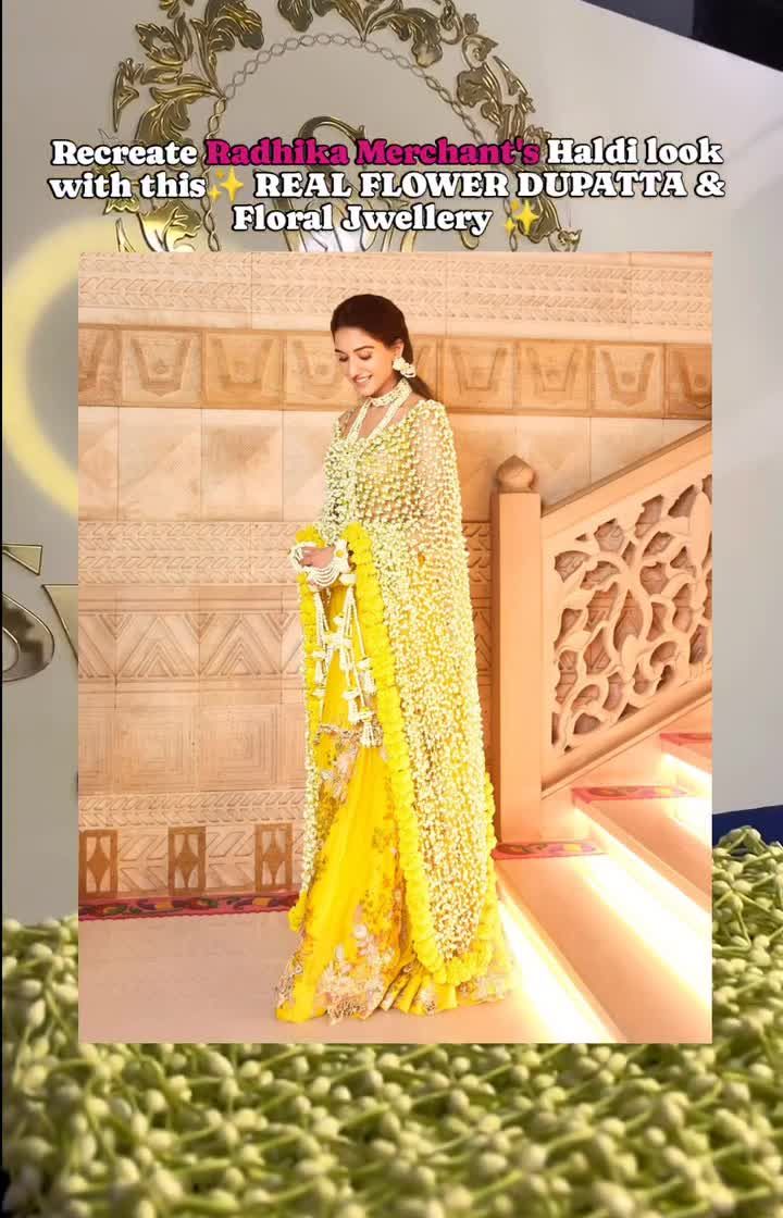 Make a grand entrance with my signature floral dupattas, also known as 'phoolancha shela'. Each piece is a delicate 'jaal' or net, hand-woven from hundreds of fresh jasmine or 'tagar' buds. I often finish them with bold rose borders to create a statement piece that is perfect for weddings or Haldi ceremonies.