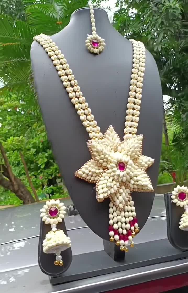 See the full picture of what I can create for you. This gallery showcases complete, coordinated floral jewellery sets on display, so you can see every detail of the necklace, earrings, maang tika, and hathphool. I offer a wide variety of styles using flowers like mogra, rose, and orchids.