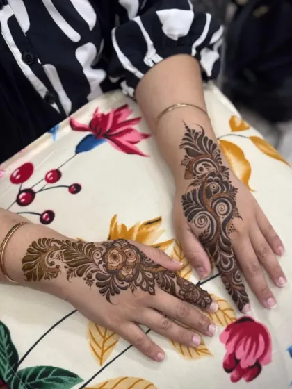 This is my specialty for those who want a grand and opulent look. I combine the bold lines of Arabic henna with the fine, detailed patterns of Indian designs to create full-coverage art for your hands and arms, perfect for a bride's sister, a close relative, or anyone wanting to make a statement.