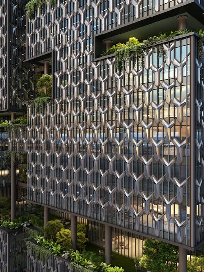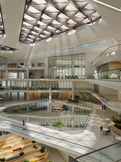 - Workspaces get greenery too, with central atriums and landscaped decks on every level.
