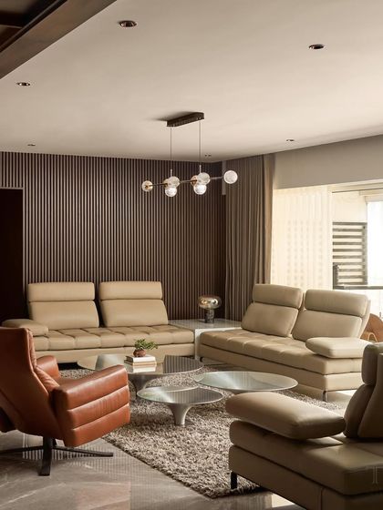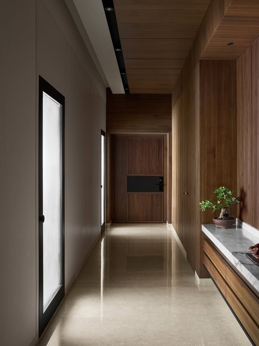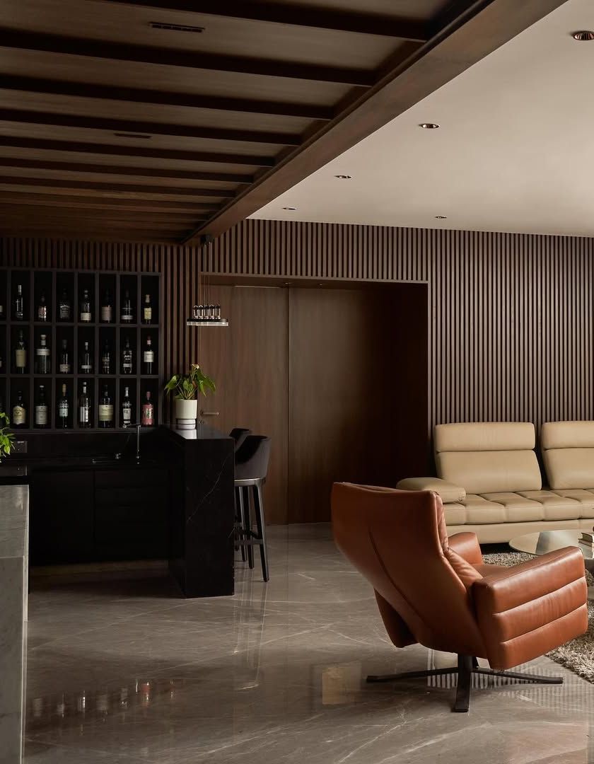 A 4 BHK, 2,700 sqft home in Juhu, this project is an exercise in minimalist luxury. We used a dark, rich material palette featuring nuanced shades of wood, marble, and leather to create a formal yet inviting atmosphere for both business and relaxation.