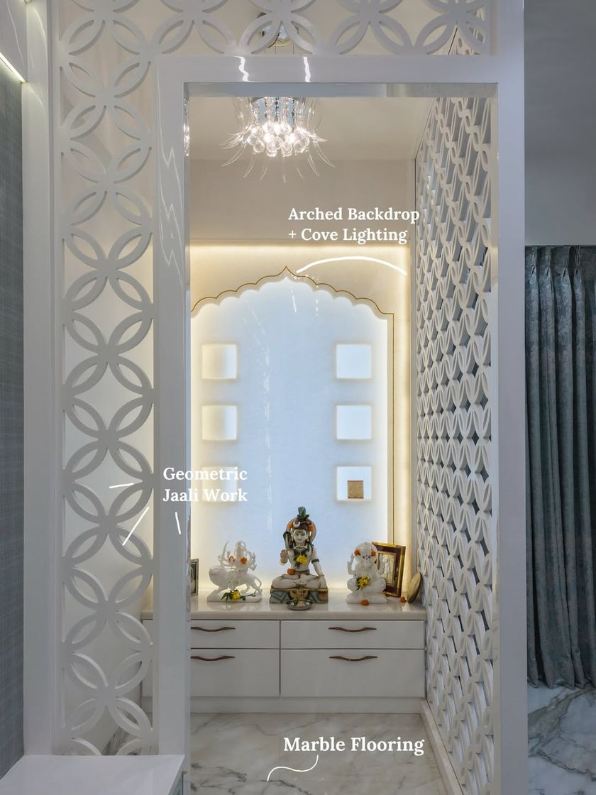 I design mandirs that are tranquil sanctuaries, whether they are seamlessly integrated into a living area or stand as a feature. Using materials like carved wood, backlit onyx, and marble with intricate jaali work, I create spaces that beautifully balance tradition with modern aesthetics.