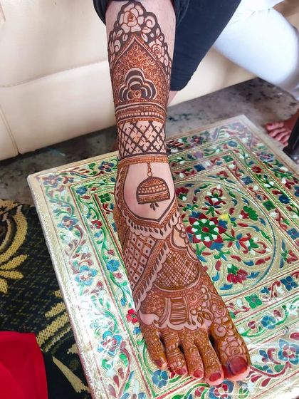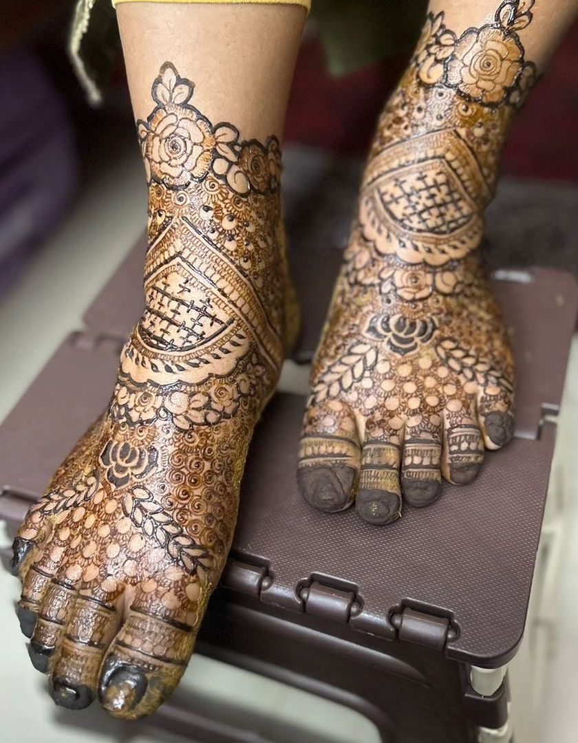 Complete your bridal look with matching henna for your feet. I create detailed patterns that cover the top of the feet and extend up to the ankles, ensuring the design complements your hand henna for a stunning head-to-toe look.