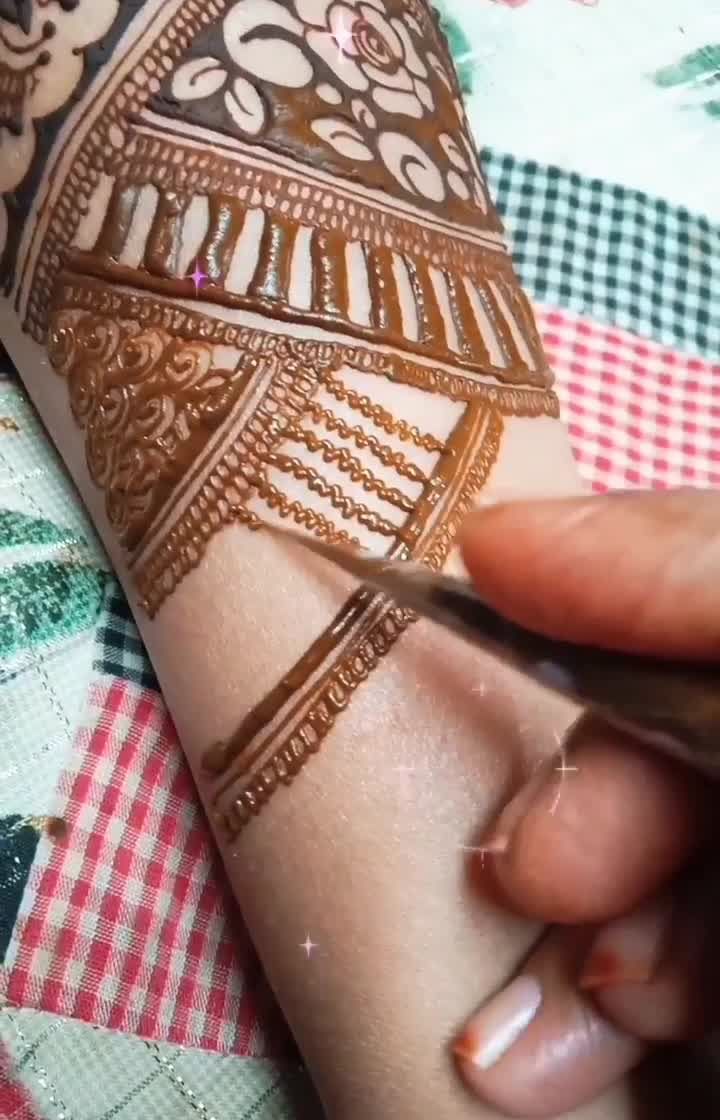 Here is a little peek into how the magic happens. This is where you can see my steady hand and the precision required to draw each line, leaf, and petal using my fresh, homemade organic henna cones.