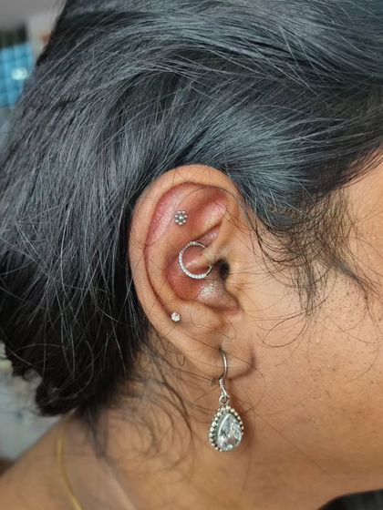 We specialize in creating a unique look that fits your ear anatomy perfectly. We offer a full range of ear piercings including lobe, upper lobe, helix, daith, rook, tragus, and custom placements. All piercings are done with sterile, single-use needles for your safety.