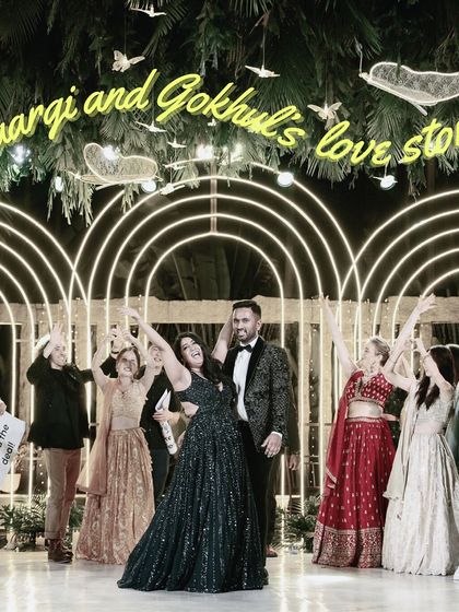 Let's turn your sangeet into your personal Bollywood film. I help you tell your story through dance, using custom concepts, fun props like banners, and a song selection that traces your journey together.