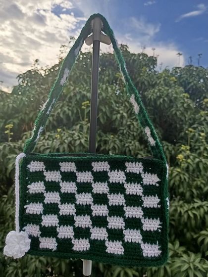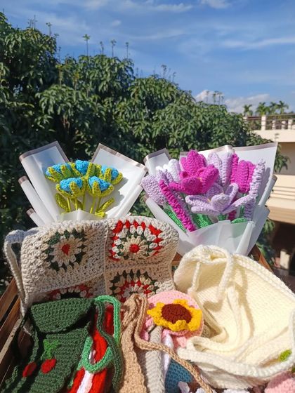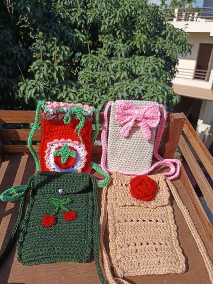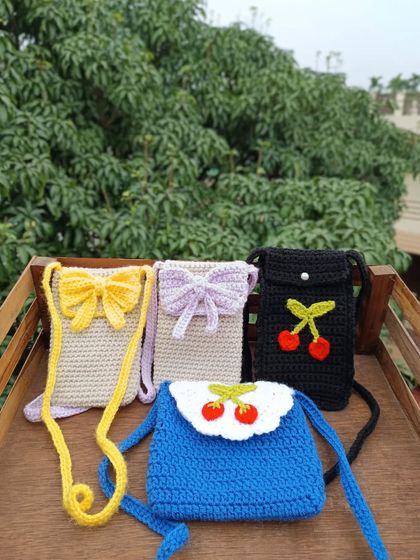 We specialize in handmade crochet bags including crossbody bags, side bags, tote bags, and pocket purses. Each piece features intricate designs like granny square patterns, floral motifs, and decorative elements such as bows and pearls.