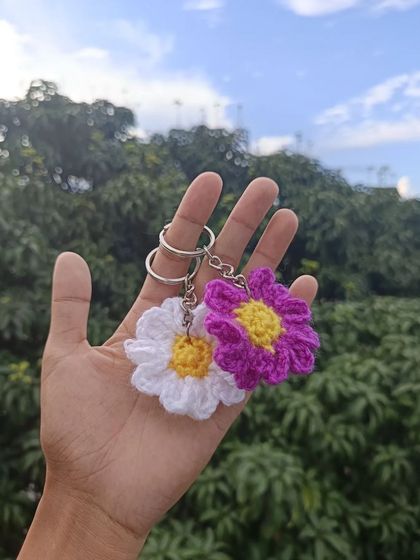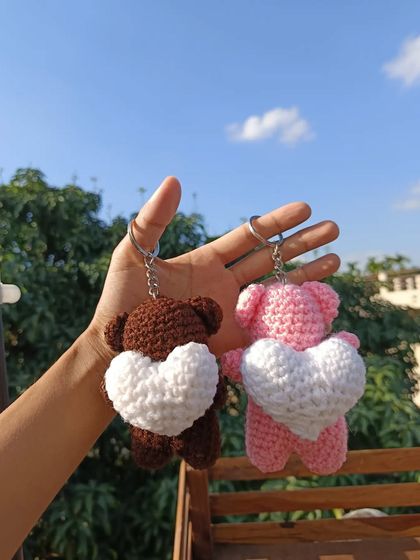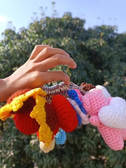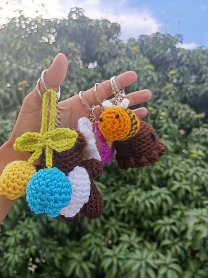 We create handmade crochet keychains featuring charming designs like strawberries, flowers, bows, and animal motifs including bears and bees. Each piece is crafted with attention to detail and can be customized to your color preferences.