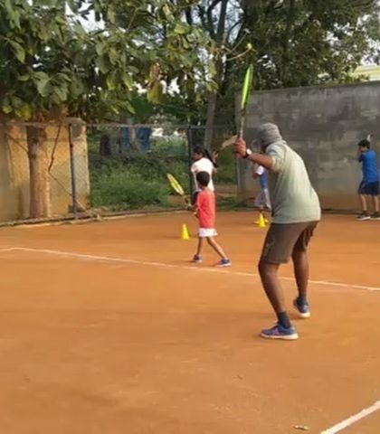 We run tennis coaching on clay courts for all levels with clear basics, structured drills, and bilingual instruction in English and Tamil.
