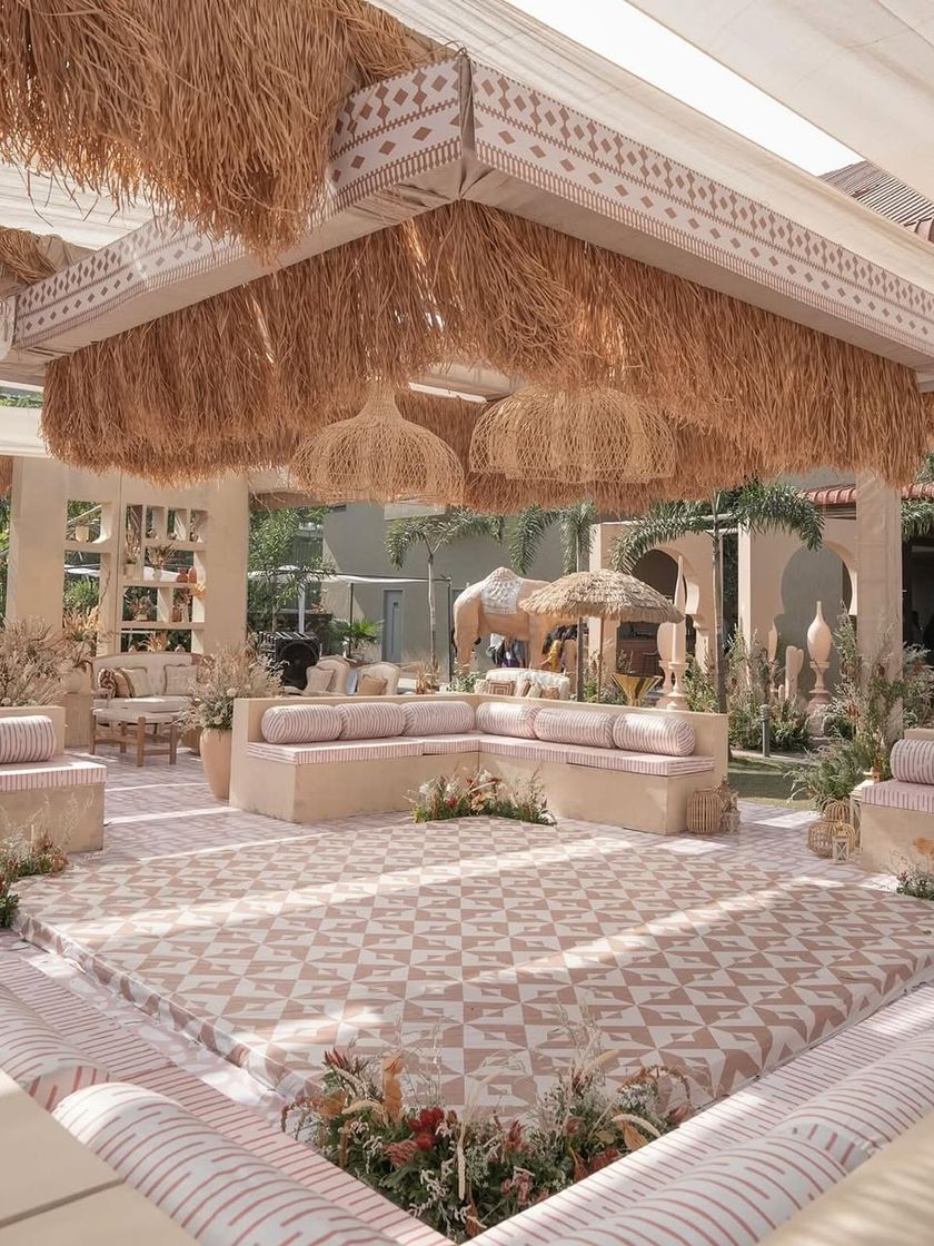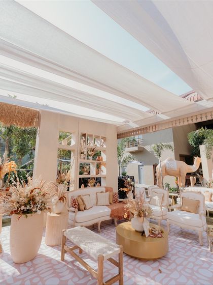 This gallery provides a complete look at one of my signature projects, a 'Desert Oasis' themed Haldi. I transformed a lawn into a rustic yet chic landscape using earthy tones, natural textures, and custom props like camel statues and cacti. This shows my ability to execute a complex, cohesive theme from start to finish.