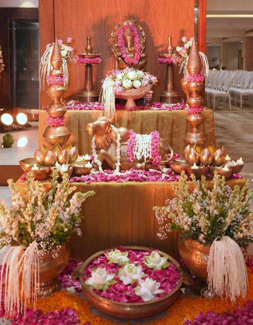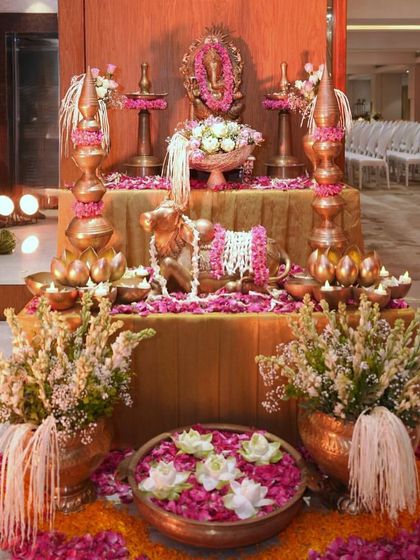 I create serene and beautiful environments for your most sacred ceremonies. Whether it's a Ganpati puja at home or a large Mata Ki Chowki, I focus on creating a pure and peaceful ambiance using fresh flowers, traditional brass elements, and thoughtful details that honor the occasion.