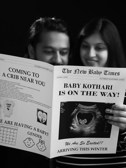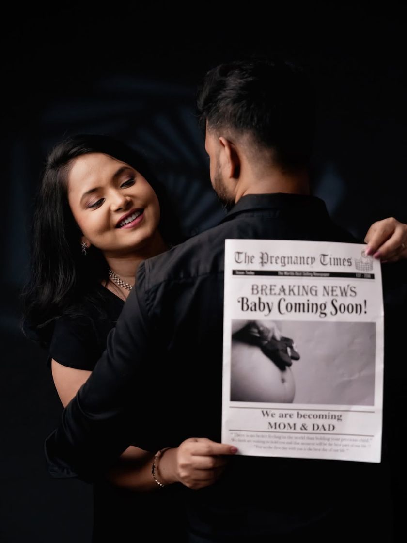 Share your exciting news with a fun and creative announcement shoot. We can design a custom concept, like this popular "Pregnancy Times" newspaper prop, to make your announcement memorable.