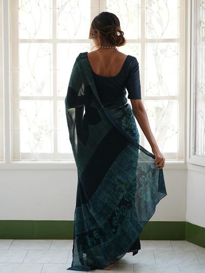 - Blouse: Includes an unstitched silk blouse piece heavily printed to match the saree borders.