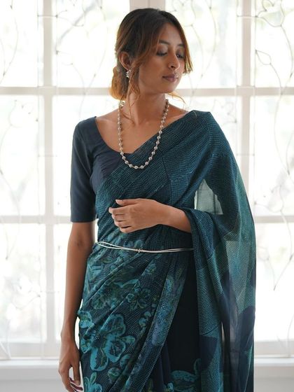 - Fabric: Premium Silk Chiffon, Crepe Silk, or Tussar Silk.