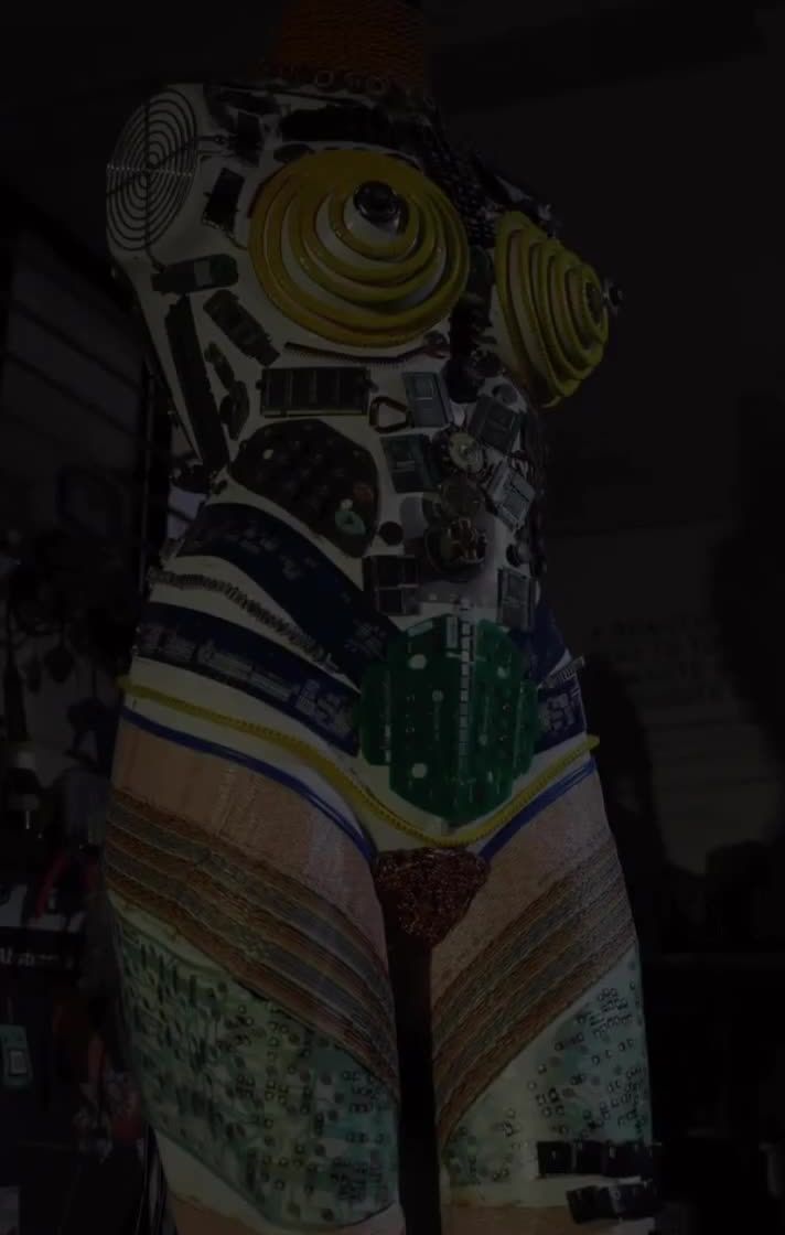 I explore the intersection of technology and fashion by creating wearable art pieces and full-sized sculptures from e-waste. I also mentor fashion students, guiding them in creating sustainable accessories from materials like circuit boards and resistors.