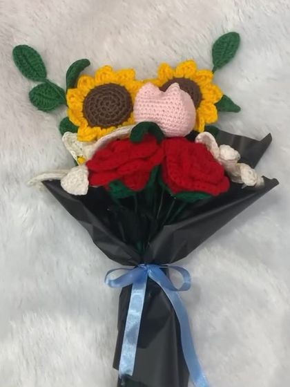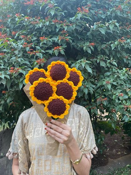 I make crochet flower bouquets that you can customize with your choice of flowers, colors, characters, and add-ons, all handmade by me in Mumbai and designed to last.